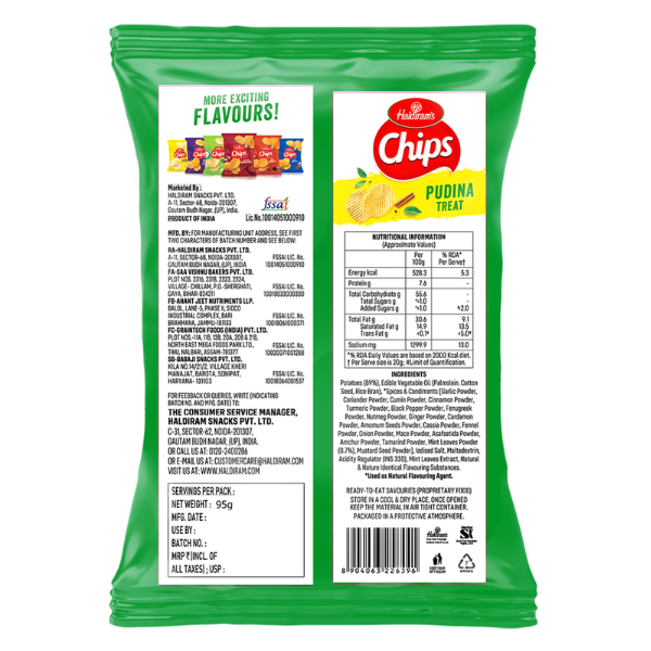 Product Code: 1008 Catagory: Snacks & Sweet Tooth Weight / Quantity: 95 Grams Trade Mark / Brand: Haldiram Material: Haldiram Pudina Treat Potato Chips Package Size: xx MM Country of Origin: India