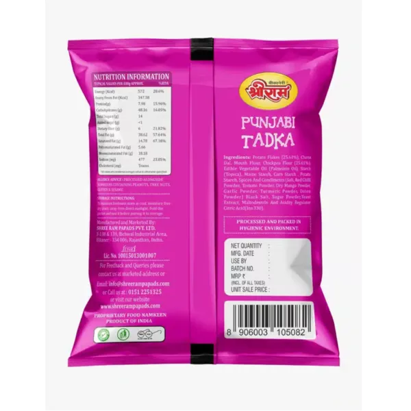 Product Code: 444 Catagory: Namkeen Weight / Quantity: 200 Grams Trade Mark / Brand: Shree Ram Material: Punjabi Tadka Package Size: xx MM Country of Origin: India