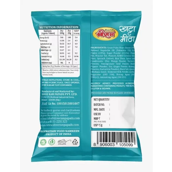 Product Code: 449 Catagory: Namkeen Weight / Quantity: 195 Grams Trade Mark / Brand: Shree Ram Material: Shree Ram Khatta Meetha Package Size: xx MM Country of Origin: India