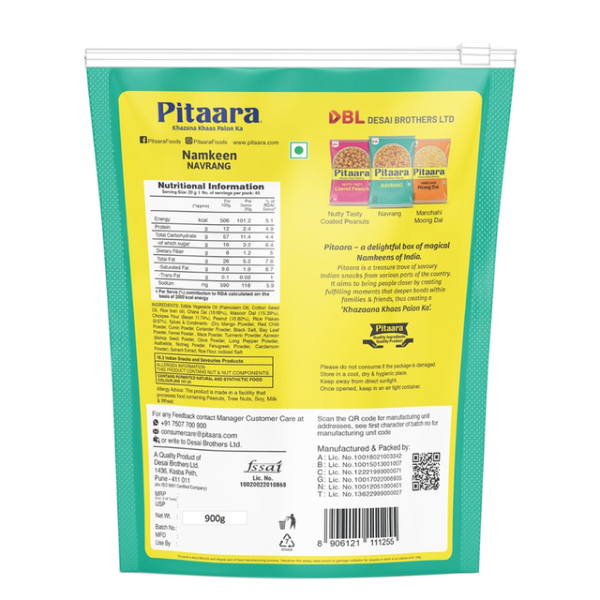 Product Code: 910 Catagory: Namkeen Weight / Quantity: 900 Grams Trade Mark / Brand: Pitaara Material: Pitaara Navrang Namkeen Package Size: xx MM Country of Origin: India