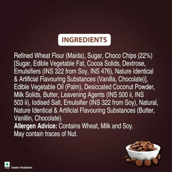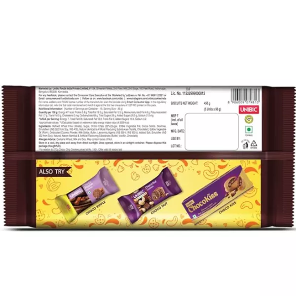 Product Code: 278 Catagory: Biscuit Weight / Quantity: 450 Grams Trade Mark / Brand: UNIBIC Material: Unibic Choco Chips Cookies Package Size: xx MM Country of Origin: India