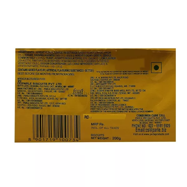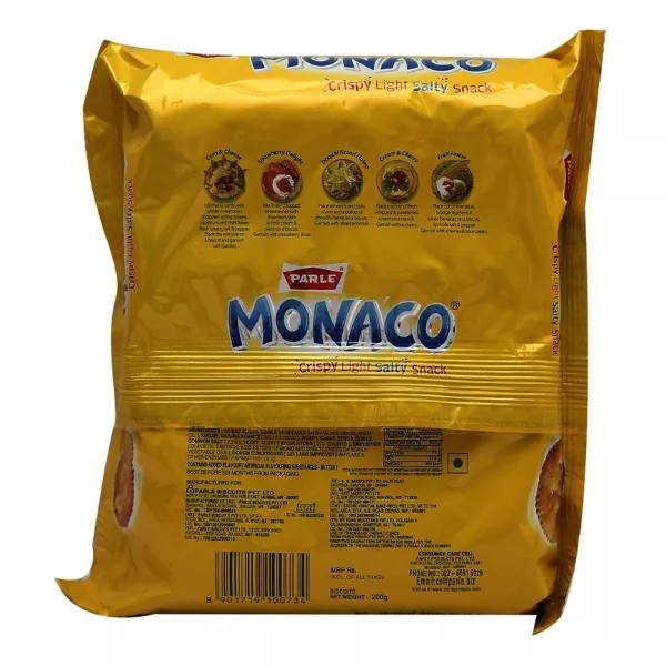 Product Code: 735 Catagory: Biscuit Weight / Quantity: 200 Grams Trade Mark / Brand: Parle Material: Parle Monaco Salted Biscuits Package Size: xx MM Country of Origin: India