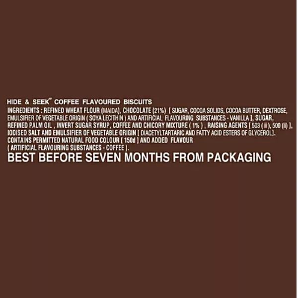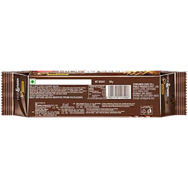 Product Code: 737 Catagory: Biscuit Weight / Quantity: 100 Grams Trade Mark / Brand: Parle Material: Parle Hide And Seek Caffe Mocha Biscuits Package Size: xx MM Country of Origin: India