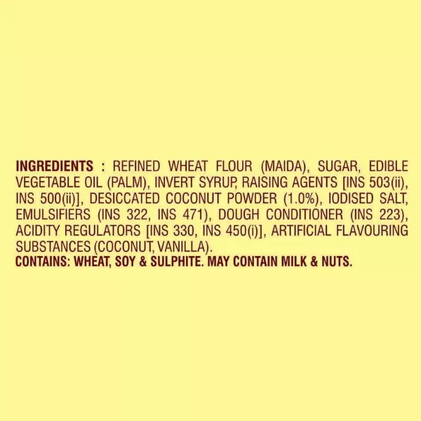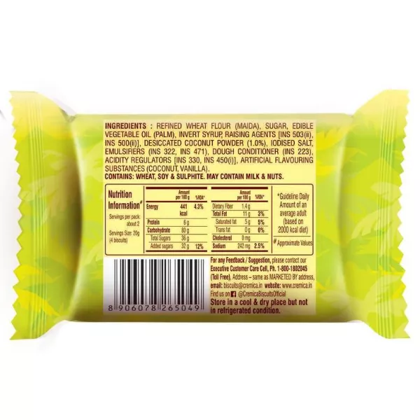 Product Code: 757 Catagory: Biscuit Weight / Quantity: 380 Grams Trade Mark / Brand: Cremica Material: Cremica Coconut Crunchies 31.7 g Package Size: xx MM Country of Origin: India