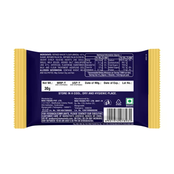Product Code: 765 Catagory: Biscuit Weight / Quantity: 360 Grams Trade Mark / Brand: Dukes Material: Dukes Italian Crisp Crunchy Thin Biscuits (30 g each) Package Size: xx MM Country of Origin: India