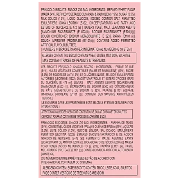 Product Code: 869 Catagory: Biscuit Weight / Quantity: 180 Grams Trade Mark / Brand: Priyagold Material: Priyagold Biscuits - Snacks Zig Zag, Package Size: xx MM Country of Origin: India