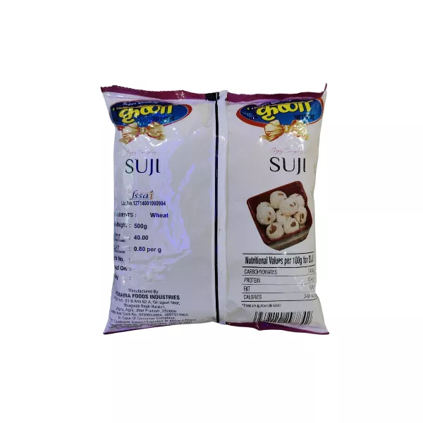 Product Code: 627 Catagory: Besan, Sooji & Maida Weight / Quantity: 500 Grams Trade Mark / Brand: Krishna Material: Krishna Sooji Package Size: xx MM Country of Origin: India