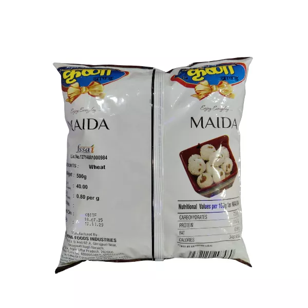 Product Code: 712 Catagory: Besan, Sooji & Maida Weight / Quantity: 500 Grams Trade Mark / Brand: Krishna Material: Krishna Maida 500 Package Size: xx MM Country of Origin: India