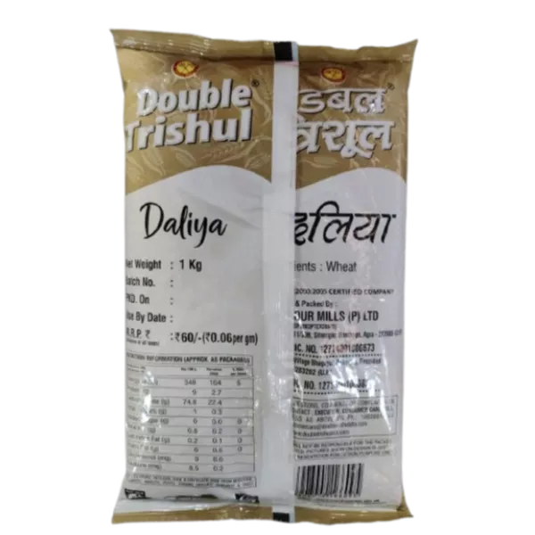 Product Code: 420 Catagory: Poha, Daliya & Other Grains Weight / Quantity: 1000 Grams Trade Mark / Brand: Double Trishul Material: Daliya Package Size: xx MM Country of Origin: India