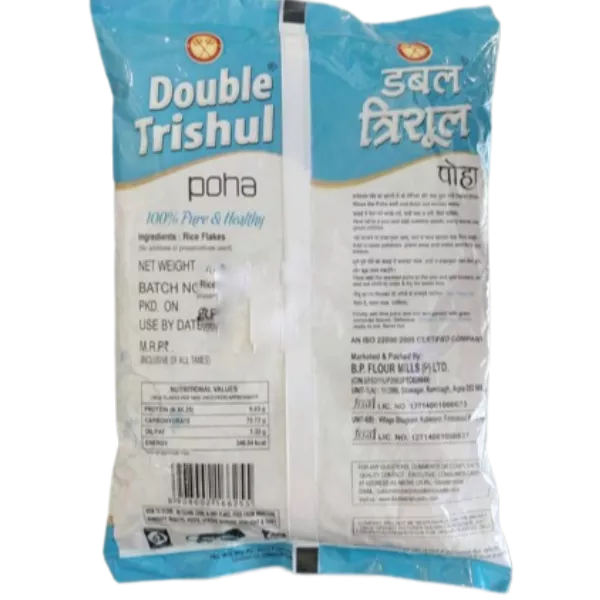 Product Code: 467 Catagory: Poha, Daliya & Other Grains Weight / Quantity: 500 Grams Trade Mark / Brand: Double Trishul Material: Double Trishul Poha Package Size: xx MM Country of Origin: India