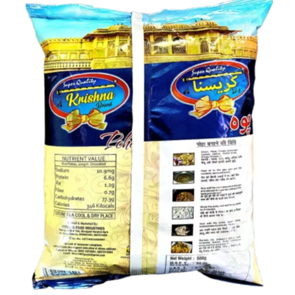 Product Code: 493 Catagory: Poha, Daliya & Other Grains Weight / Quantity: 500 Grams Trade Mark / Brand: Krishna Material: Krishna Poha Package Size: xx MM Country of Origin: India