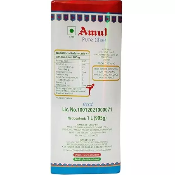 Product Code: 703 Catagory: Ghee & Vanaspati Weight / Quantity: 1000 ML Trade Mark / Brand: Amul Material: Amul Pure Ghee, 1 Liter Package Size: xx MM Country of Origin: India