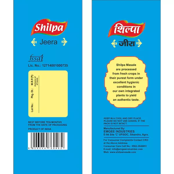 Product Code: 460 Catagory: Whole Spices Weight / Quantity: 100 Grams Trade Mark / Brand: Shilpa Material: Shilpa Jeera (Cumin) Seeds Package Size: xx MM Country of Origin: India