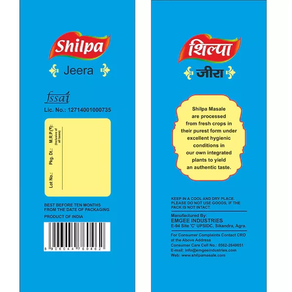 Product Code: 524 Catagory: Whole Spices Weight / Quantity: 250 Grams Trade Mark / Brand: Shilpa Material: Shilpa Jeera (Cumin) Seeds Shilpa Jeera (Cumin) Seeds Package Size: xx MM Country of Origin: India