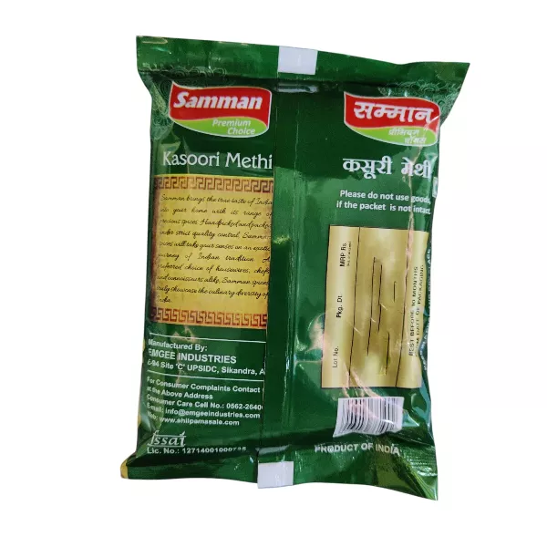 Product Code: 525 Catagory: Whole Spices Weight / Quantity: 50 Grams Trade Mark / Brand: Samman Material: Samman Kasuri Methi Package Size: xx MM Country of Origin: India