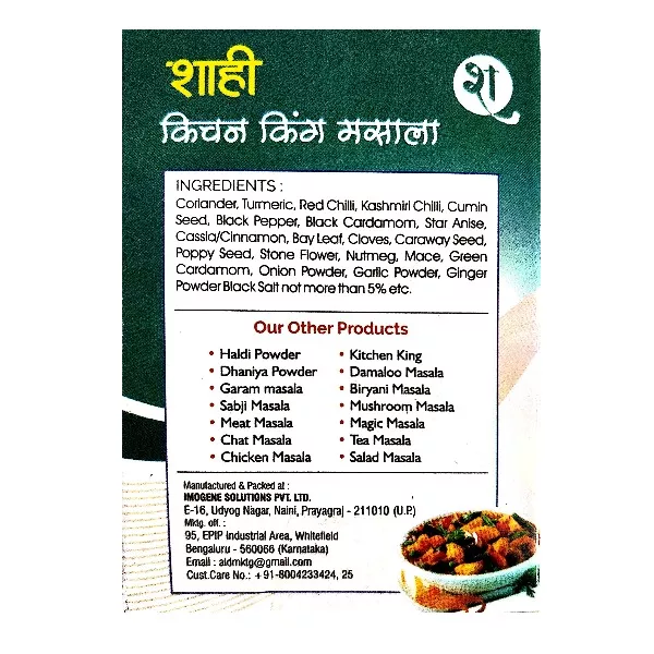 Product Code: 201 Catagory: Powdered Spices Weight / Quantity: 12 Grams Trade Mark / Brand: SHAHI MASALE Material: Package Size: xx MM Country of Origin: India