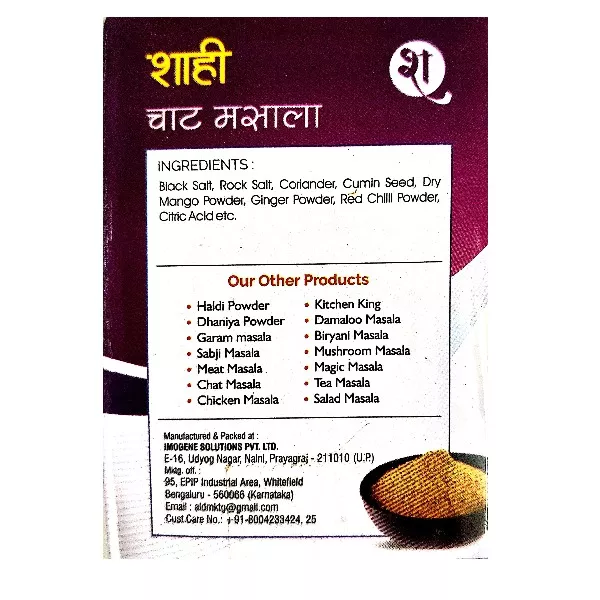 Product Code: 202 Catagory: Powdered Spices Weight / Quantity: 14 Grams Trade Mark / Brand: SHAHI MASALE Material: Chat Masala Powder Package Size: xx MM Country of Origin: India