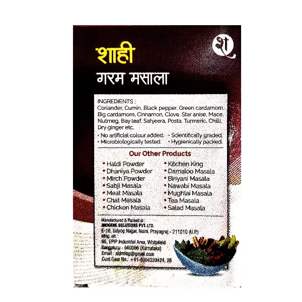 Product Code: 210 Catagory: Powdered Spices Weight / Quantity: 50 Grams Trade Mark / Brand: SHAHI MASALE Material: Garam Masala Powder Box Package Size: xx MM Country of Origin: India
