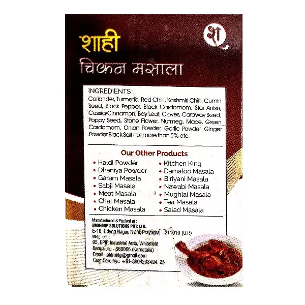 Product Code: 213 Catagory: Powdered Spices Weight / Quantity: 50 Grams Trade Mark / Brand: SHAHI MASALE Material: Chicken Masala Powder Package Size: xx MM Country of Origin: India