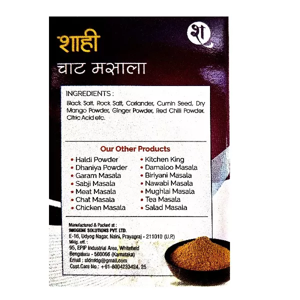 Product Code: 214 Catagory: Powdered Spices Weight / Quantity: 50 Grams Trade Mark / Brand: SHAHI MASALE Material: Chat Masala Powder Package Size: xx MM Country of Origin: India