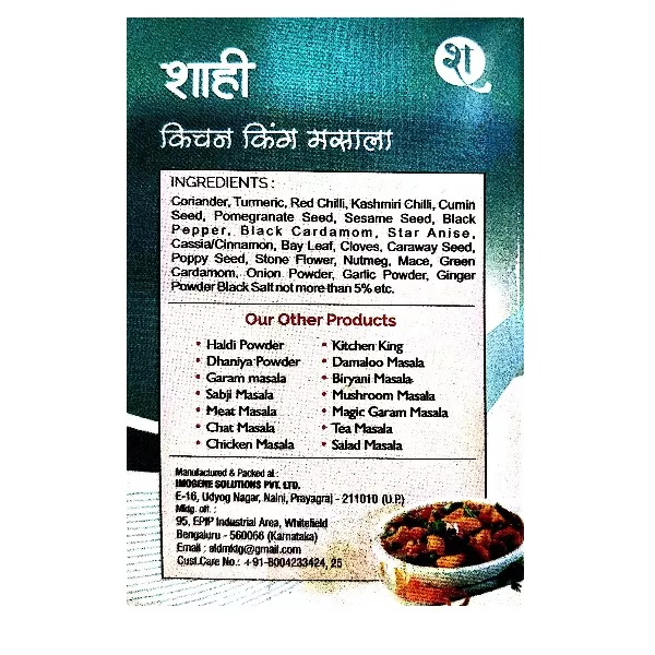 Product Code: 216 Catagory: Powdered Spices Weight / Quantity: 50 Grams Trade Mark / Brand: SHAHI MASALE Material: Kitchen KIng Masala Powder Package Size: xx MM Country of Origin: India