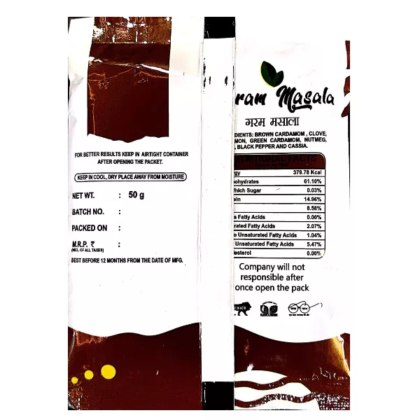 Product Code: 303 Catagory: Powdered Spices Weight / Quantity: 50 Grams Trade Mark / Brand: SHAHI MASALE Material: Garam Masala Powder Pouch Package Size: xx MM Country of Origin: India