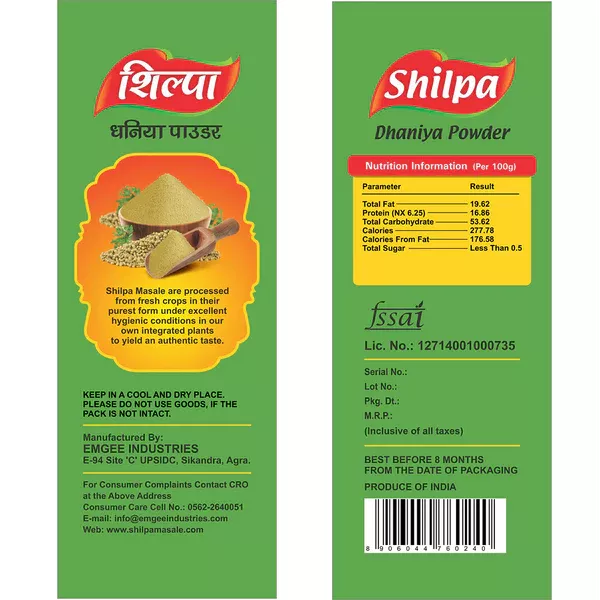 Product Code: 454 Catagory: Powdered Spices Weight / Quantity: 200 Grams Trade Mark / Brand: Shilpa Material: Shilpa Masale Dhaniya (Coriander) Powder Pouch Package Size: xx MM Country of Origin: India