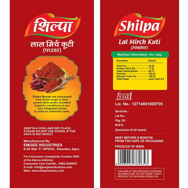 Product Code: 456 Catagory: Powdered Spices Weight / Quantity: 100 Grams Trade Mark / Brand: Shilpa Material: Shilpa Masale Kuti Lal Mirch (Crushed Red Chilli) Powder Spices Package Size: xx MM Country of Origin: India