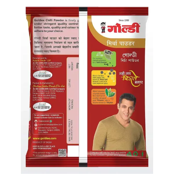 Product Code: 468 Catagory: Powdered Spices Weight / Quantity: 500 Grams Trade Mark / Brand: Goldiee Material: Goldiee Red Chilli Powder Package Size: xx MM Country of Origin: India