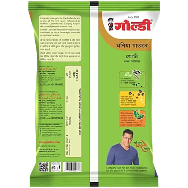 Product Code: 473 Catagory: Powdered Spices Weight / Quantity: 500 Grams Trade Mark / Brand: Goldiee Material: Goldiee Coriander/Dhaniya Powder Package Size: xx MM Country of Origin: India