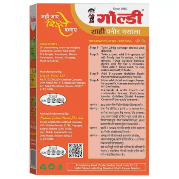 Product Code: 586 Catagory: Powdered Spices Weight / Quantity: 50 Grams Trade Mark / Brand: Goldiee Material: Goldiee Shahi Paneer Masala Package Size: xx MM Country of Origin: India
