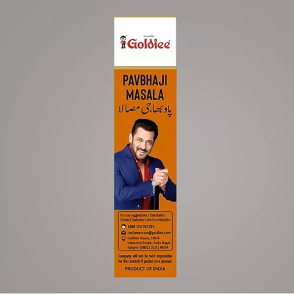 Product Code: 591 Catagory: Powdered Spices Weight / Quantity: 50 Grams Trade Mark / Brand: Gol Material: Goldiee Pavbhaji Masala Package Size: xx MM Country of Origin: India