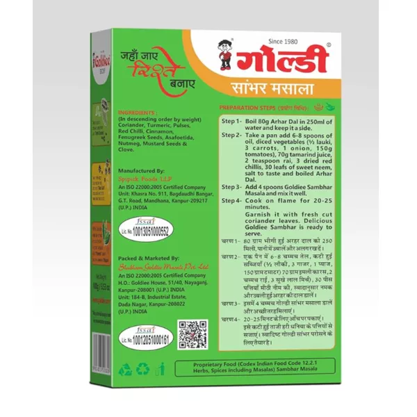 Product Code: 592 Catagory: Powdered Spices Weight / Quantity: 50 Grams Trade Mark / Brand: Goldiee Material: Goldiee Sambhar Masala Package Size: xx MM Country of Origin: India
