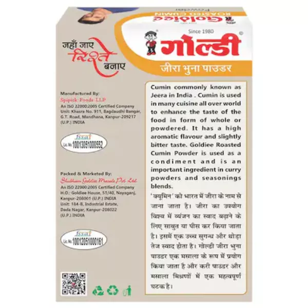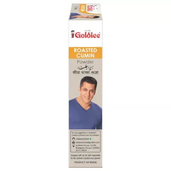 Product Code: 684 Catagory: Powdered Spices Weight / Quantity: 100 Grams Trade Mark / Brand: Goldiee Material: Goldiee Roasted Cumin Powder Package Size: xx MM Country of Origin: India