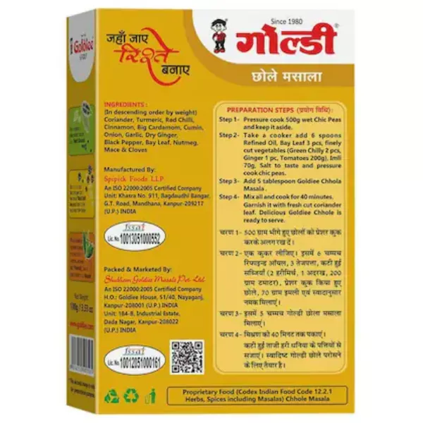 Product Code: 686 Catagory: Powdered Spices Weight / Quantity: 100 Grams Trade Mark / Brand: Goldiee Material: Goldiee Chhole Masala Package Size: xx MM Country of Origin: India