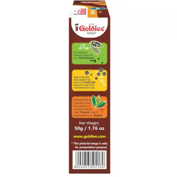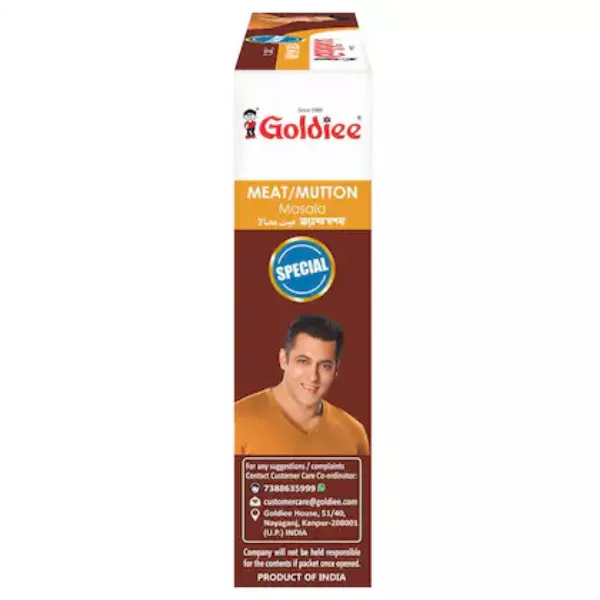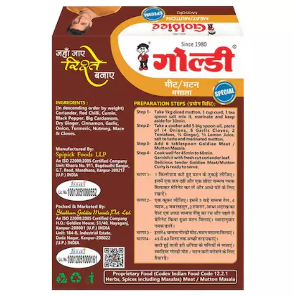 Product Code: 721 Catagory: Powdered Spices Weight / Quantity: 50 Grams Trade Mark / Brand: Goldiee Material: Goldiee Special Meat/Mutton Masala Package Size: xx MM Country of Origin: India