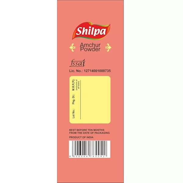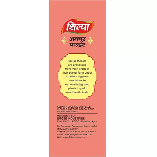 Product Code: 725 Catagory: Powdered Spices Weight / Quantity: 100 Grams Trade Mark / Brand: Shilpa Material: Shilpa Amchur (Dry Mango) Package Size: xx MM Country of Origin: India
