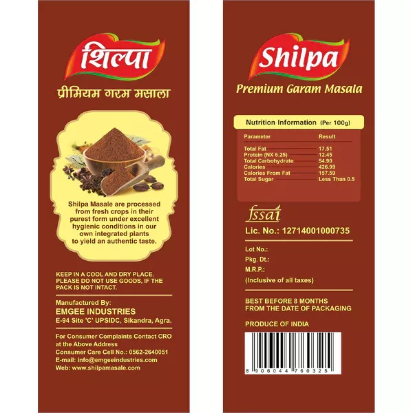 Product Code: 779 Catagory: Powdered Spices Weight / Quantity: 50 Grams Trade Mark / Brand: Shilpa Material: Shilpa Garam Masala PP Spices Pouch Package Size: xx MM Country of Origin: India