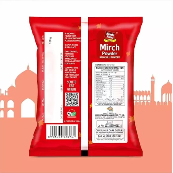 Product Code: 845 Catagory: Powdered Spices Weight / Quantity: 100 Grams Trade Mark / Brand: Munshi Panna Material: Specials Mirch Powder Package Size: xx MM Country of Origin: India