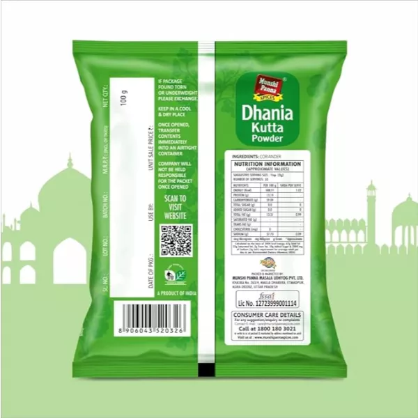 Product Code: 848 Catagory: Powdered Spices Weight / Quantity: 100 Grams Trade Mark / Brand: Munshi Panna Material: Dhaniya Kutta Powder (Coriander Powder) Package Size: xx MM Country of Origin: India