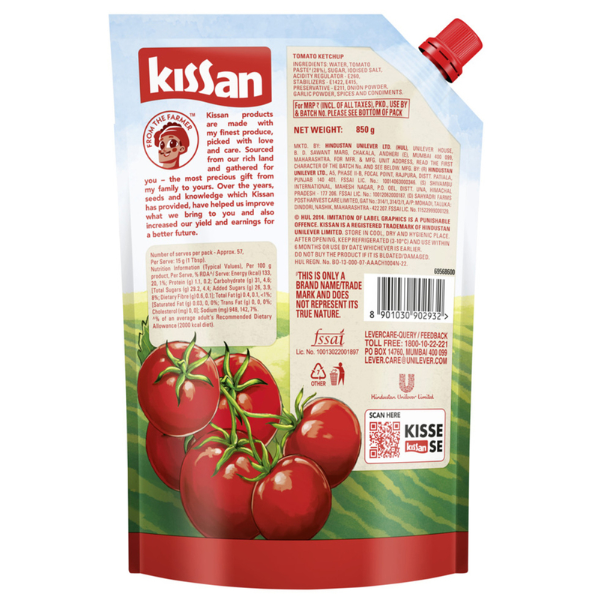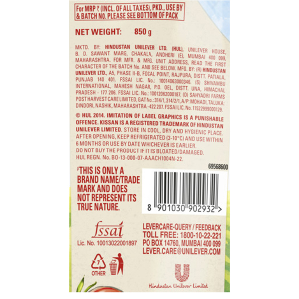 Product Code: 876 Catagory: Tomato & Chilli Ketchup Weight / Quantity: 850 Grams Trade Mark / Brand: Kissan Material: Kissan Tomato Ketchup Package Size: xx MM Country of Origin: India