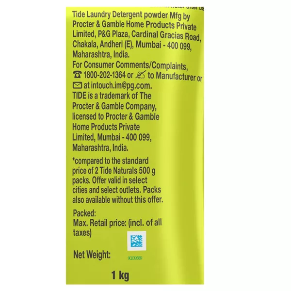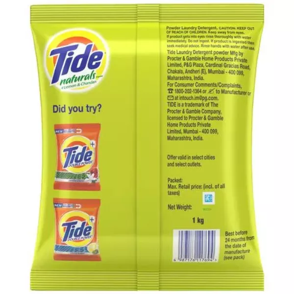 Product Code: 372 Catagory: Detergent Powder & Bars Weight / Quantity: 1000 Grams Trade Mark / Brand: Tide Material: Tide Detergent Powder Naturals Package Size: xx MM Country of Origin: India