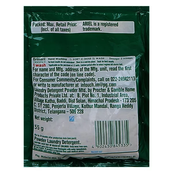 Product Code: 385 Catagory: Detergent Powder & Bars Weight / Quantity: 55 Grams Trade Mark / Brand: Ariel Material: Ariel Detergent Powder Package Size: xx MM Country of Origin: India