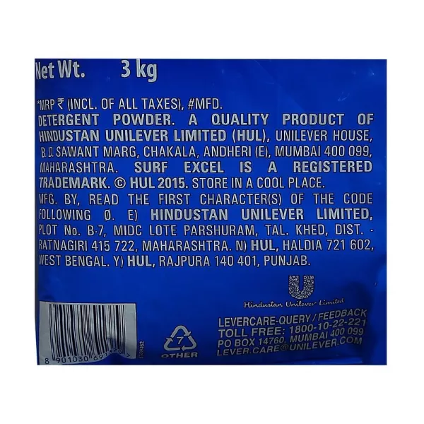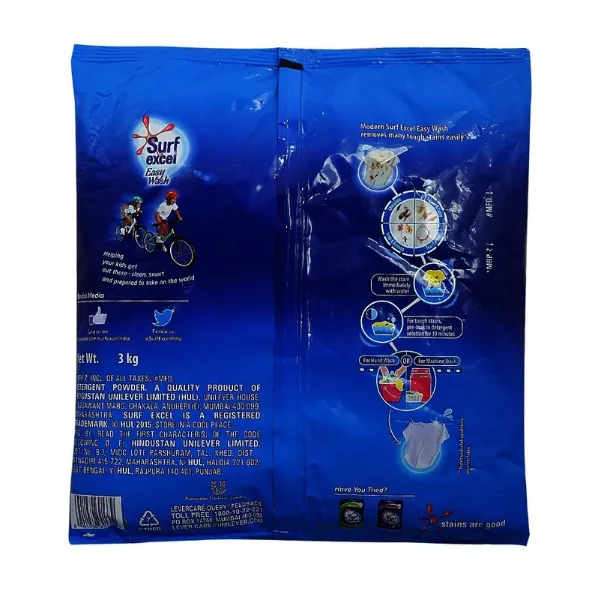 Product Code: 560 Catagory: Detergent Powder & Bars Weight / Quantity: 3000 Grams Trade Mark / Brand: Surf Excel Material: Surf Excel Easy Wash Detergent Powder Package Size: xx MM Country of Origin: India