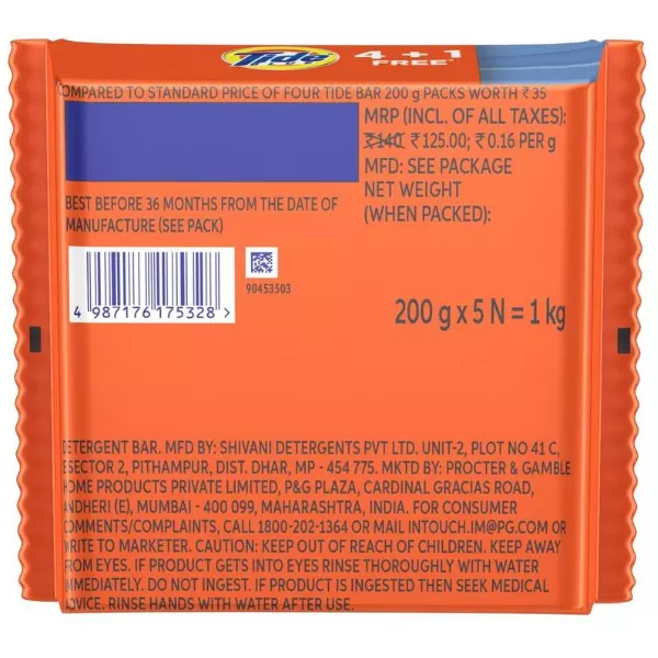 Product Code: 772 Catagory: Detergent Powder & Bars Weight / Quantity: 1000 Grams Trade Mark / Brand: Tide Material: Tide Blue Detergent Bar 4 N+ 1 N Package Size: xx MM Country of Origin: India