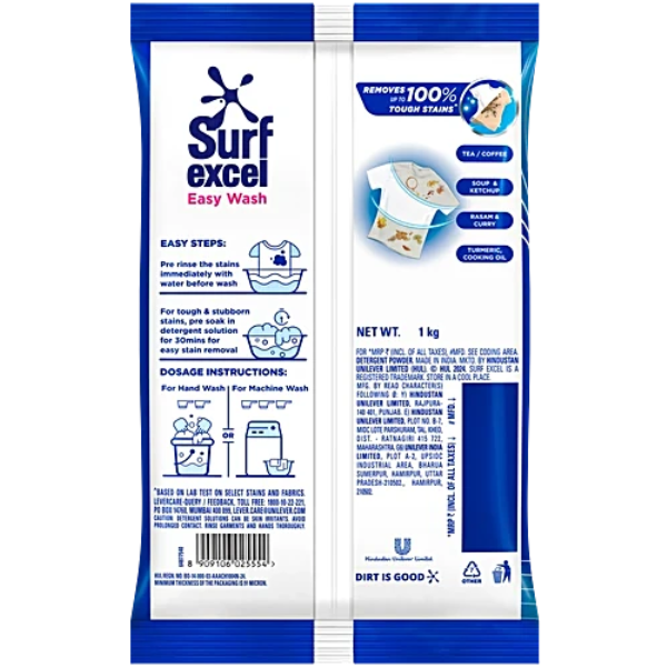 Product Code: 915 Catagory: Detergent Powder & Bars Weight / Quantity: 1000 Grams Trade Mark / Brand: Surf Excel Material: Surf Excel Easy Wash Detergent Powder Package Size: xx MM Country of Origin: India