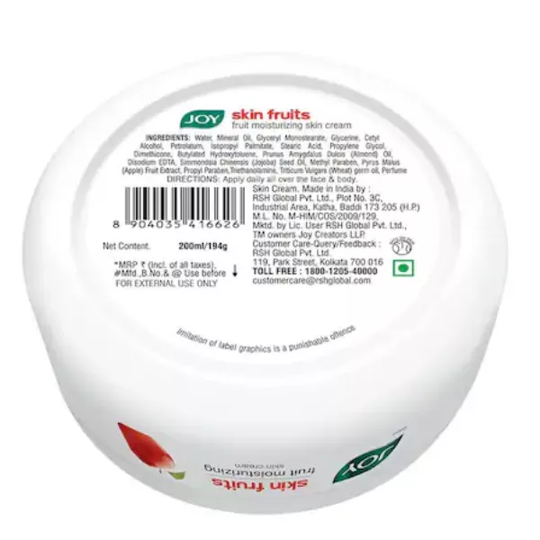 Product Code: 275 Catagory: Face & Body Moisturizers Weight / Quantity: 200 ML Trade Mark / Brand: JOY Material: Joy Skin Fruits Fruit Moisturizing Skin Cream Package Size: xx MM Country of Origin: India