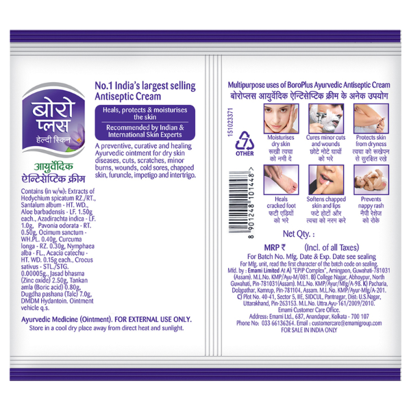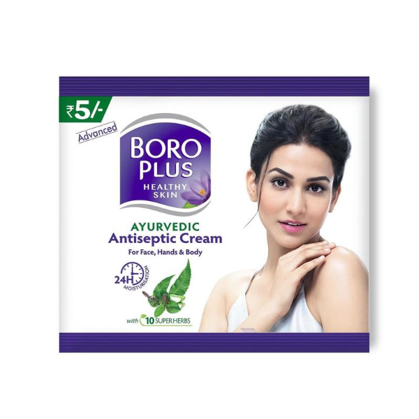 Product Code: 882 Catagory: Face & Body Moisturizers Weight / Quantity: 4 ML Trade Mark / Brand: Boroplus Material: BoroPlus Ayurvedic Antiseptic Cream Package Size: xx MM Country of Origin: India