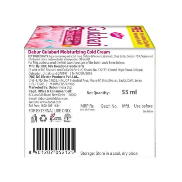 Product Code: 884 Catagory: Face & Body Moisturizers Weight / Quantity: 30 ML Trade Mark / Brand: Dabur Material: Dabur Gulabari Cold Cream Package Size: xx MM Country of Origin: India