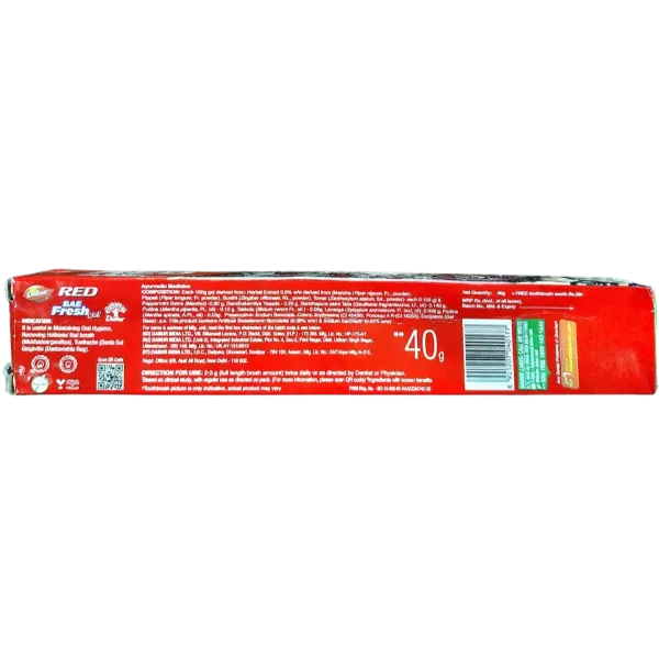 Product Code: 304 Catagory: Oral Care Weight / Quantity: 40 Grams Trade Mark / Brand: Dabur Material: Dabur Red Bae Fresh Gel Package Size: xx MM Country of Origin: India